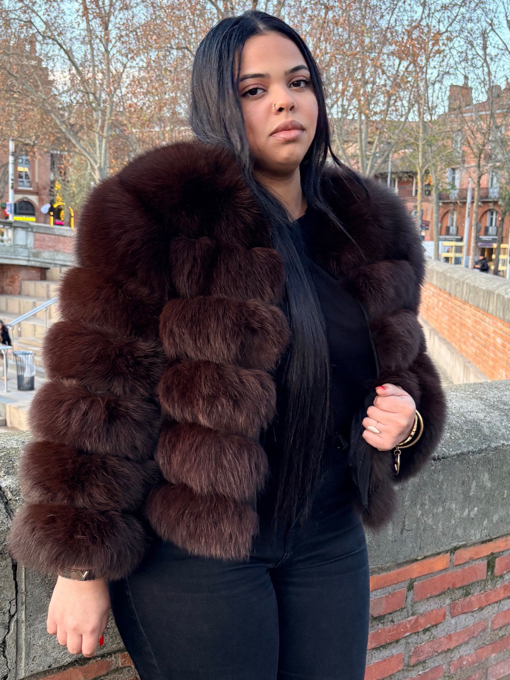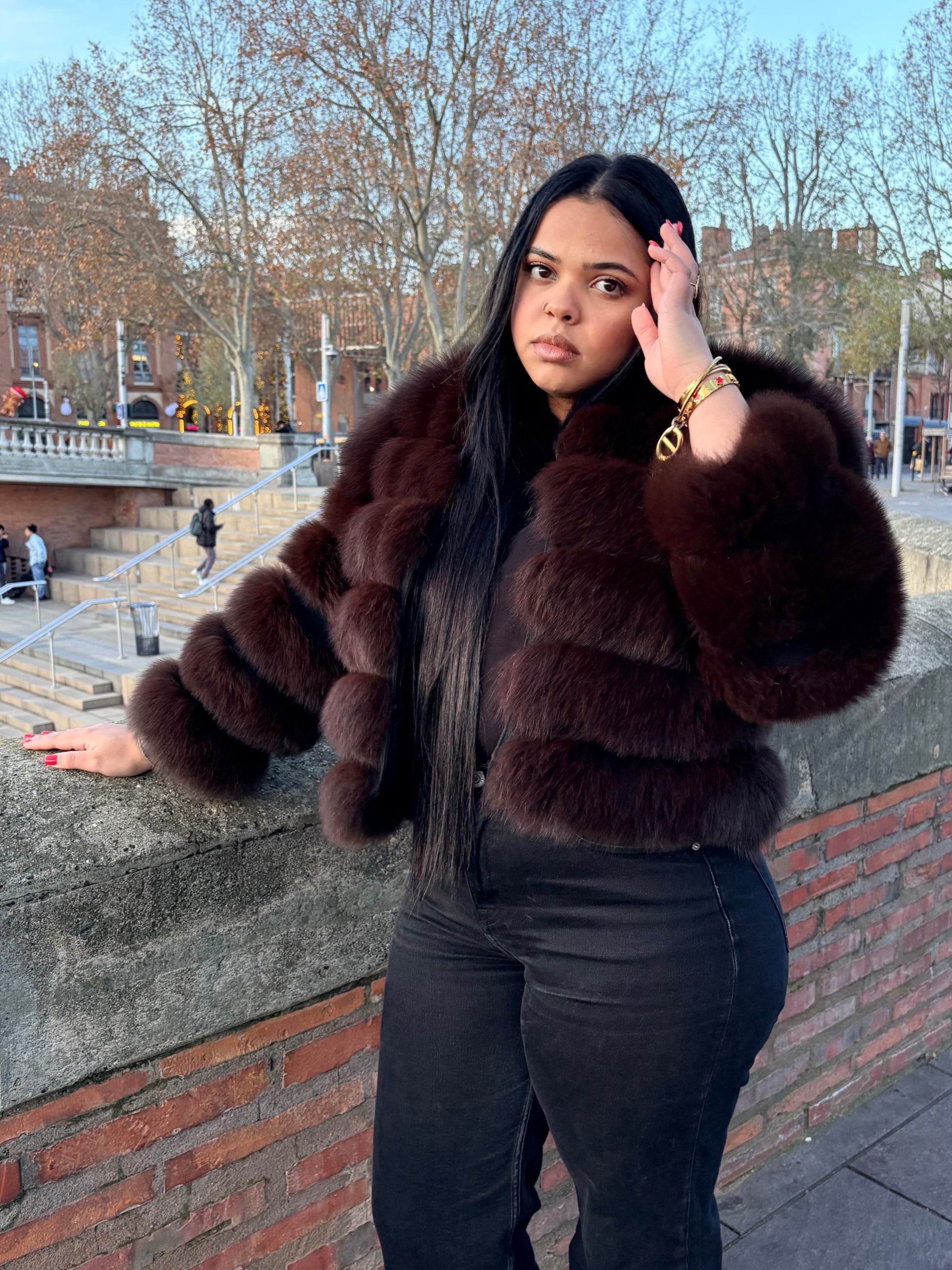 Polyvalente et intemporelle, cette fourrure marron chocolat en poils de renard et putois est parfaite pour celles qui recherchent un manteau d'hiver chic, modulable et facile à associer.